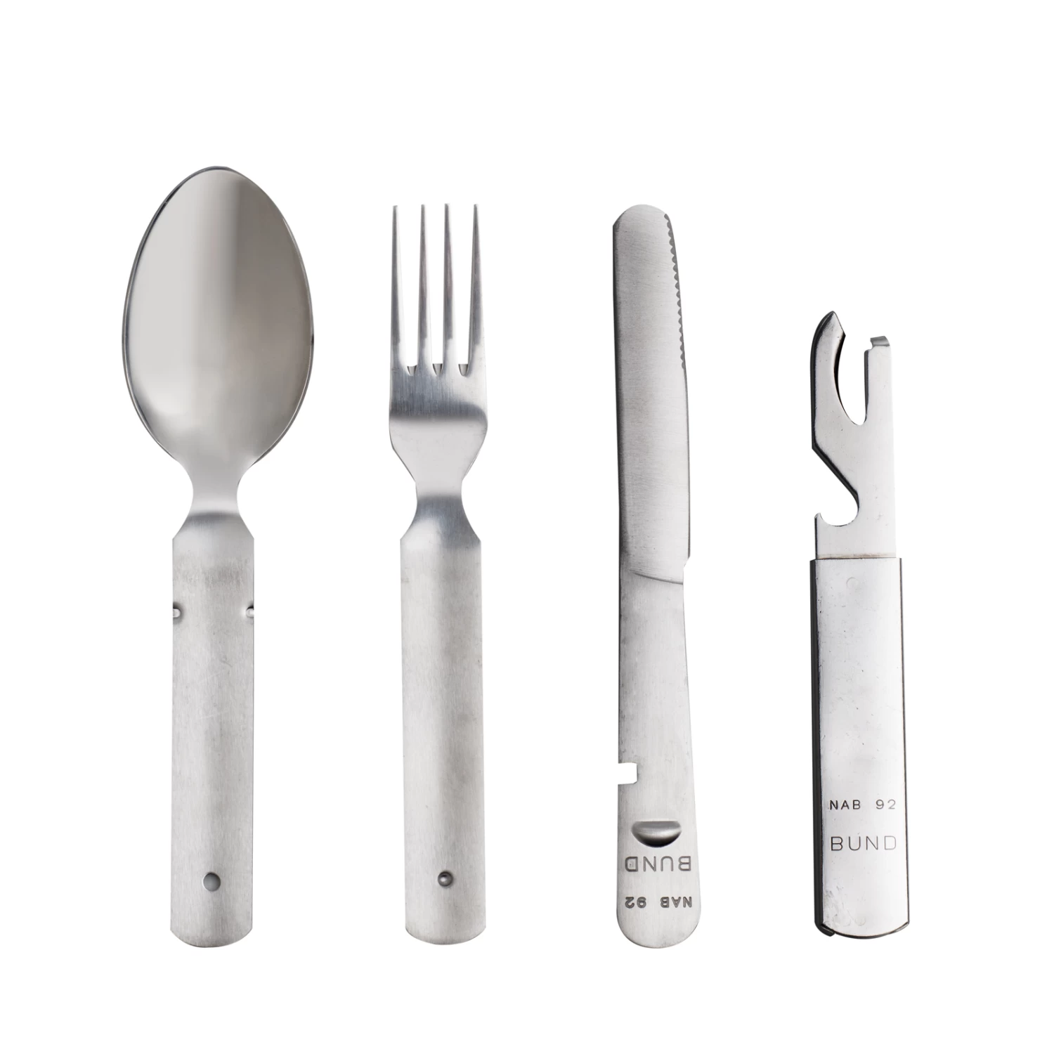 Das BW Feldbesteck ist das praktische Essbesteck für Unterwegs. Das 4-tlg. Feldessbesteck in schwerer, extra stabiler Ausführung besteht aus Messer, Gabel, Löffel und Spezialhalterung mit Flaschen- und Büchsenöffner, die platzsparend zusammen gesteckt werden können. Mit diesem Reisebesteck ist alles kompakt und sicher dabei, was für eine Mahlzeit gebraucht wird. Hinterher lässt sich jedes Einzelteil leicht wieder reinigen. Das Besteck ist aus rostfreiem Edelstahl gefertigt.
