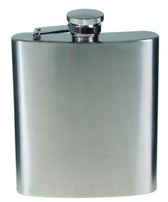 Edelstahl Taschenflasche für 225ml Inhalt aus gebürstetem Edelstahl mit praktischem Schrauberschluss von Fox Outdoor. Der Schraubverschluss ist per Gelenkverbinder an den Flachmann befestigt und kann so nicht verloren gehen.