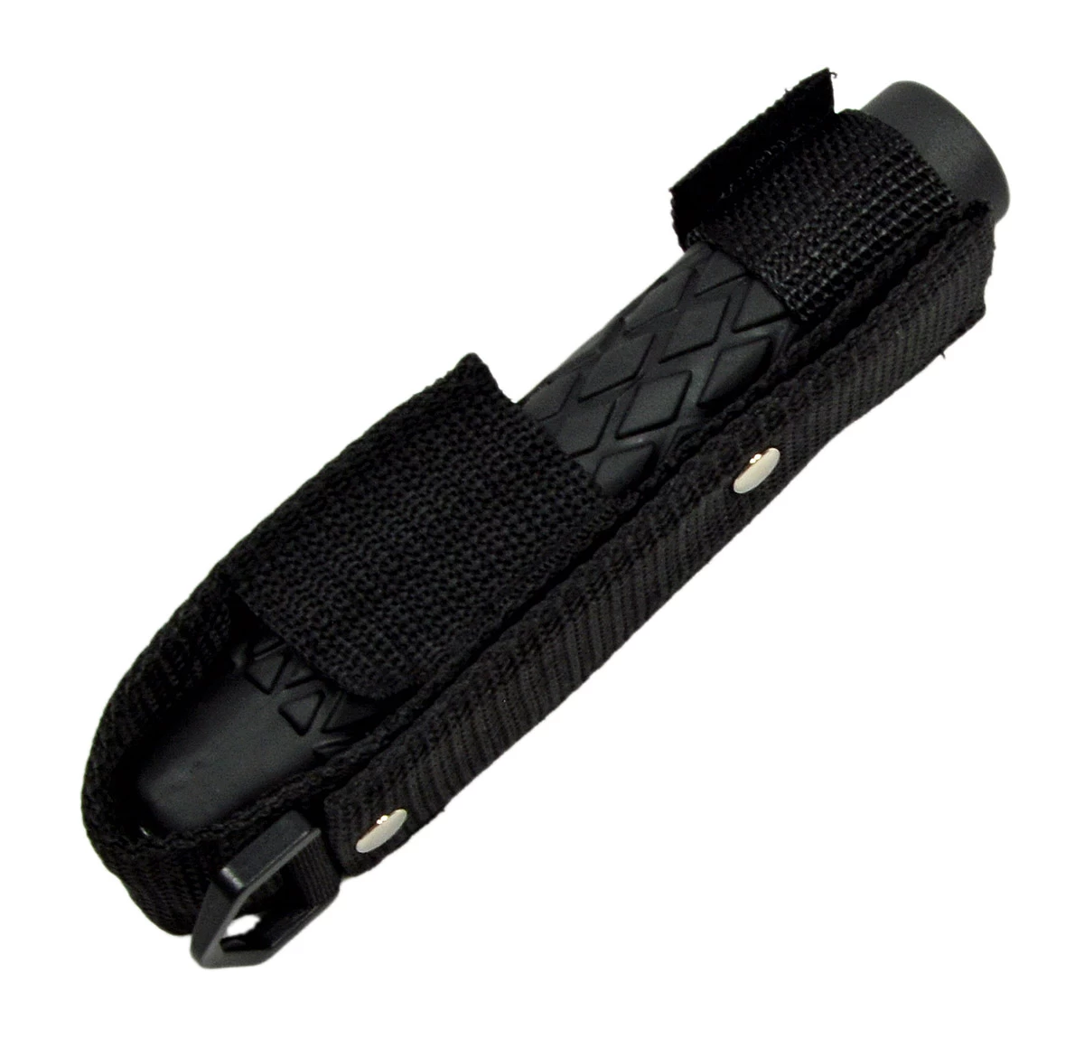 Der Metall Schlagstock Teleskop 3S in schwarz wird auf seine komplette Länge mit 3 Sektionen ausgefahren. Der 16 Zoll Teleskopschlagstock hat geöffnet eine Gesamtlänge von 40,5cm. Zum Öffnen wird das Teleskop per Schleuderbewegung ausgefahren, so dass sich die Sektionen in sich arretieren. Zum Schließen reicht ein Klopfen der Spitze auf einen harten Gegenstand, so dass ich die Arretierung löst und der Schlagstock wieder zusammen geschoben werden kann. Der Teleskopschlagstock ist aus hochwertigem gehärtetem Stahl gefertigt und verfügt über einen ergonomisch geformten Strukturgriff aus Weich-PVC, der einen sicheren Halt garantiert. Der Schlagstock wird inkl. Nylonetui zur Gürtel/Koppelbefestigung geliefert.